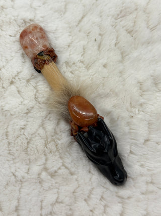 Black Obsidian & Sunstone Dragon Shamanic Healing Wand with Carnelian and Petrified Wood