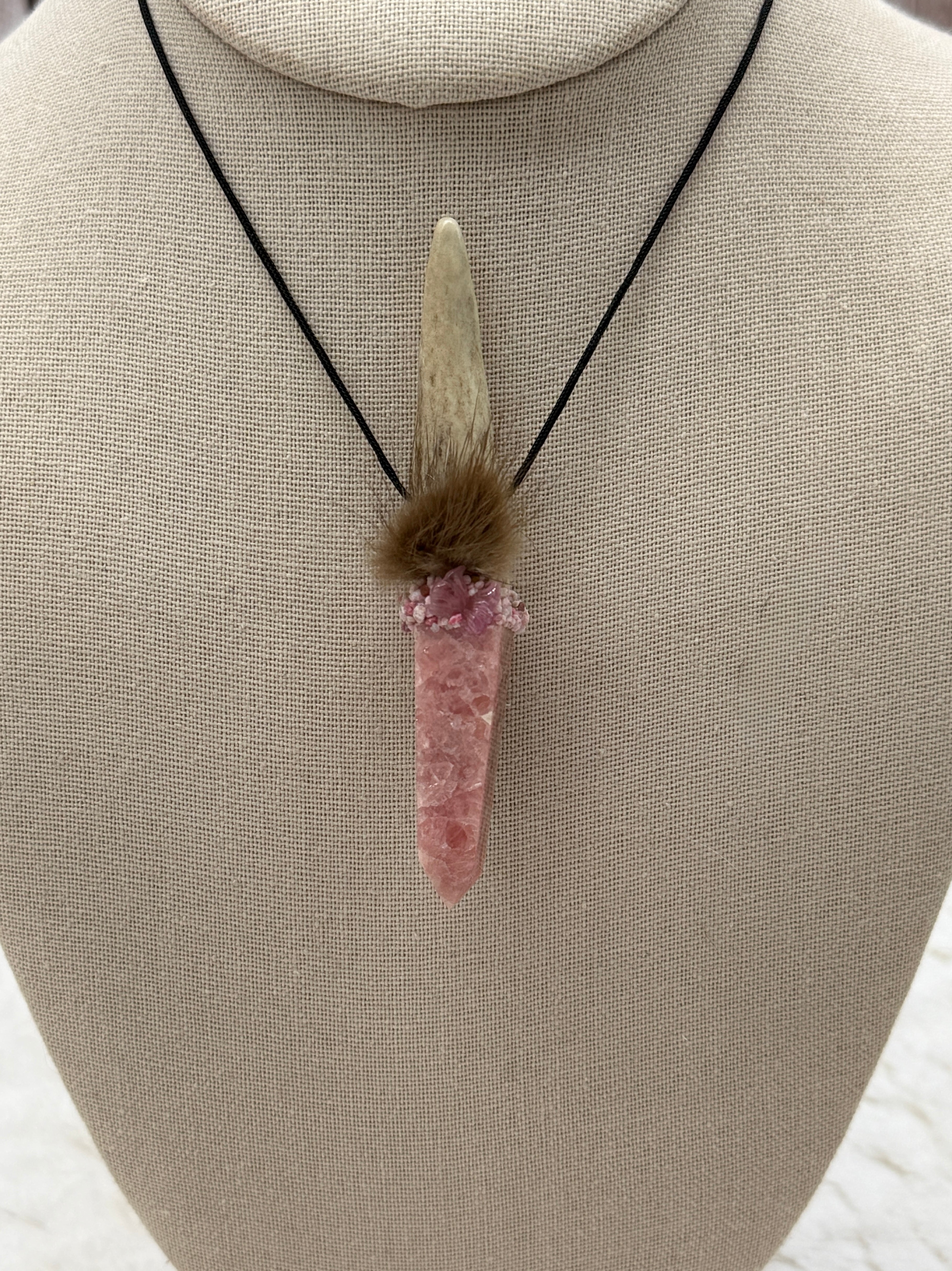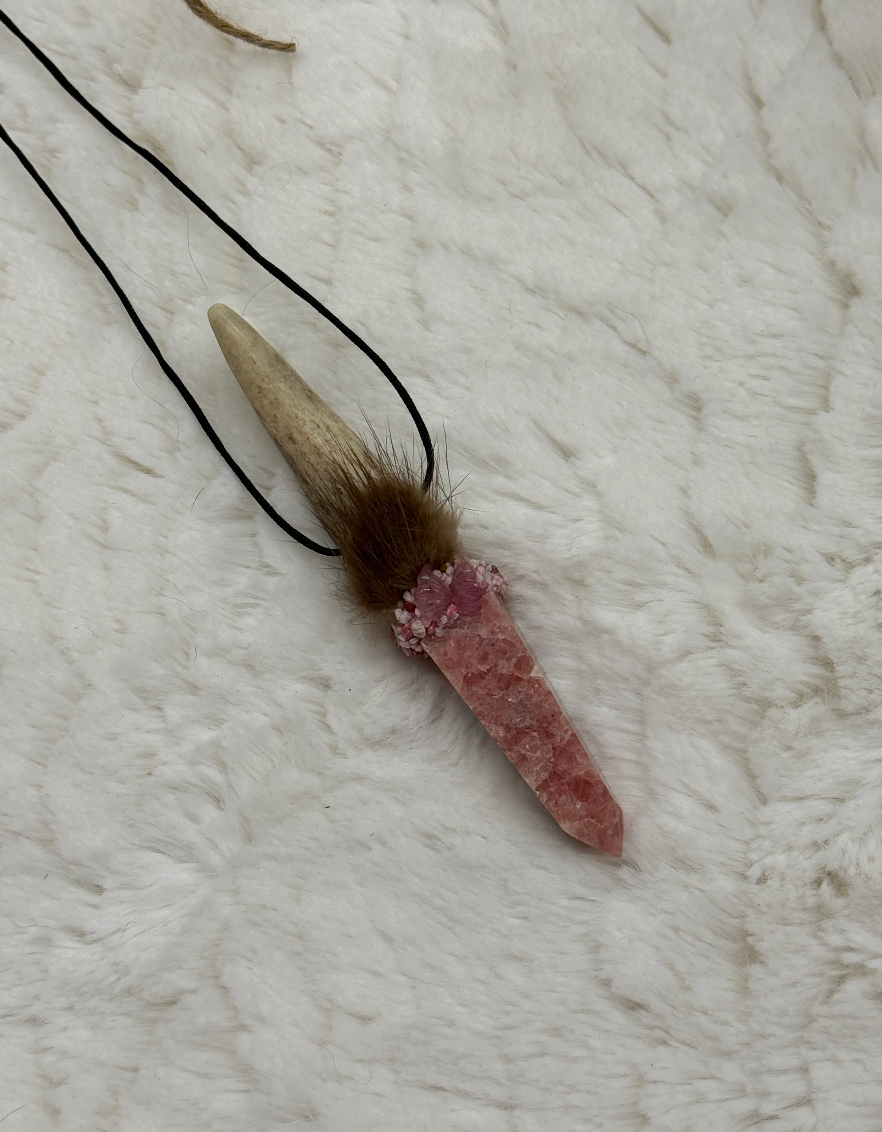 This wand carries the soft yet powerful current of heart-centered renewal and transformation, guiding you through change with grace and deep emotional healing. Deer Medicine brings adaptability and gentleness, reminding you that each new path begins with innocence and courage, while its antler connects you to Higher Wisdom and the Heart of the Goddess. Rhodochrosite and Thulite radiate Divine Love, releasing old pain, healing grief, and strengthening compassion, empowering you to love yourself and others with authenticity. Pink Tourmaline Butterfly amplifies this energy, soothing emotional wounds and encouraging forgiveness, joy, and trust. Butterfly’s medicine itself whispers of transformation, lightness, and the freedom to shine as your true self. Beaver Medicine grounds these energies with focus and perseverance, teaching you to build your dreams into reality while keeping balance in your life. Together, these allies create a sacred tool of heart healing, relationship renewal, and awakened passion, guiding you to live with confidence, compassion, and inner peace.