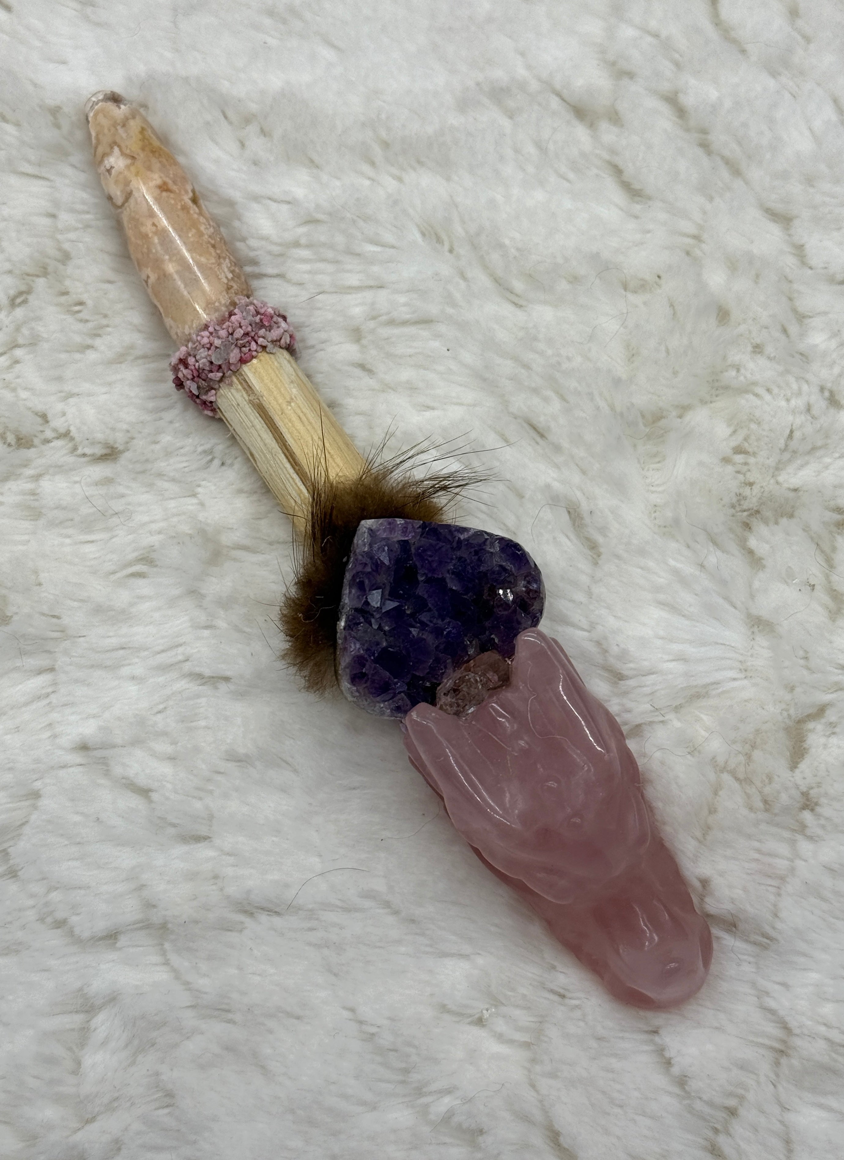 Amethyst – powerful protective stone; strong healing and cleansing powers; enhances spiritual awareness, promotes love and forgiveness; encourages selflessness, promotes emotional centering; dispels fear and anger; calming and stimulating synergy; balances and connects physical, mental and emotional bodies linking them to the spiritual.