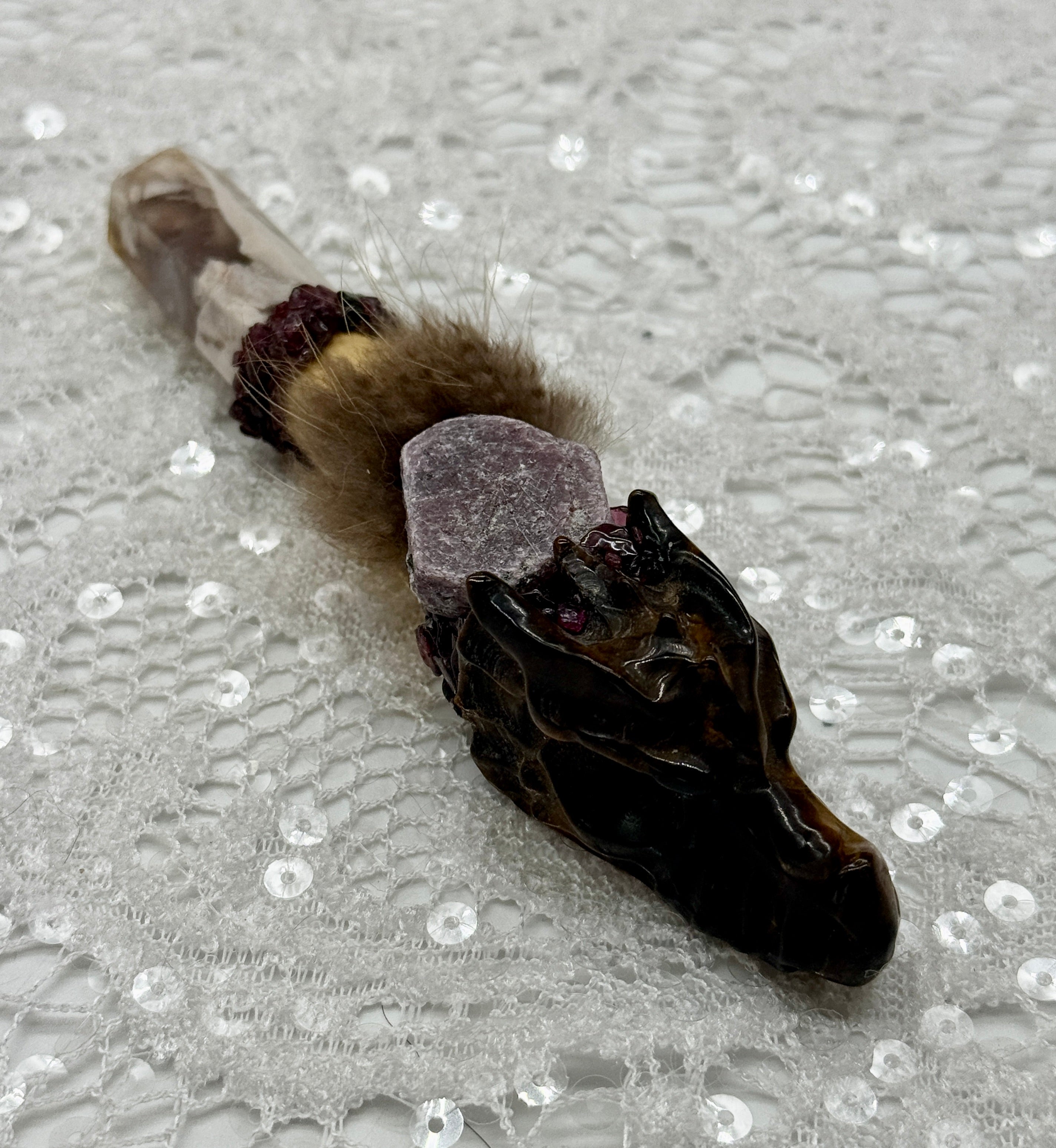 Tiger Eye Dragon, Flower Agate Point, Ruby, Garnet Shamanic Healing Wand, Empowerment, Confidence, Transformation, Protection